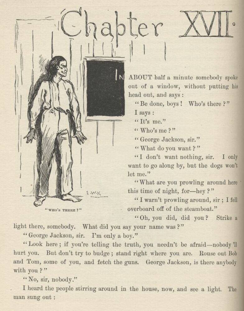 | Die Abenteuer des Huckleberry Finn | 1920 | Hirth, Edouard | 33 | 32 | 1 | What made you think I'd like it? | -huck -tom -4p+ -fem -sdc -drawing | hf_1920_hir_ch033_ill1 |
