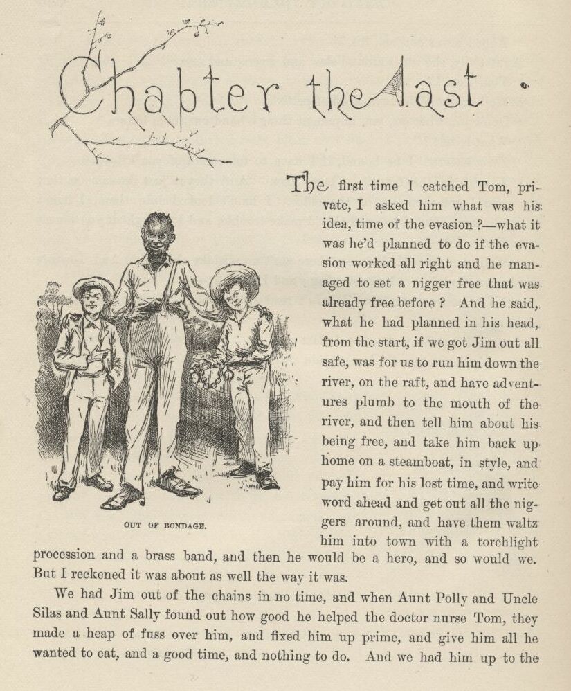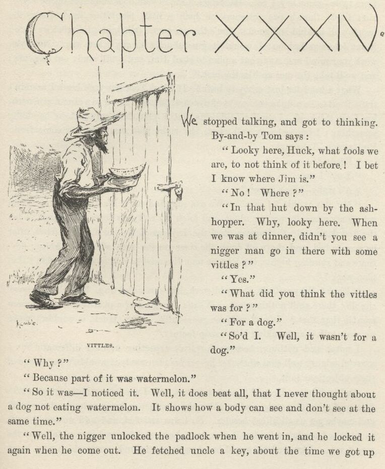 | Huckleberry Finns Abenteuer und Fahrten | 1897 | Schroedter, Hans | 43 | 34 | 1 | Out of Bondage | -jim -1p -drawing | hf_1897_schr_ch043_ill1 |