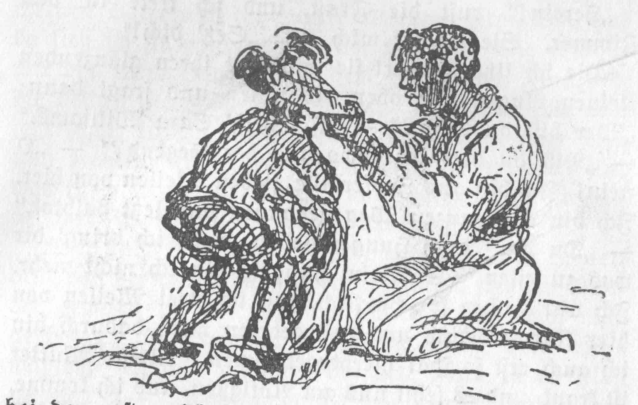 | Huckleberry Finns Abenteuer und Fahrten | 1897 | Schroedter, Hans | 18 | 17 | 1 | Hugging | -huck -jim -2p -drawing | hf_1897_schr_ch018_ill1 |