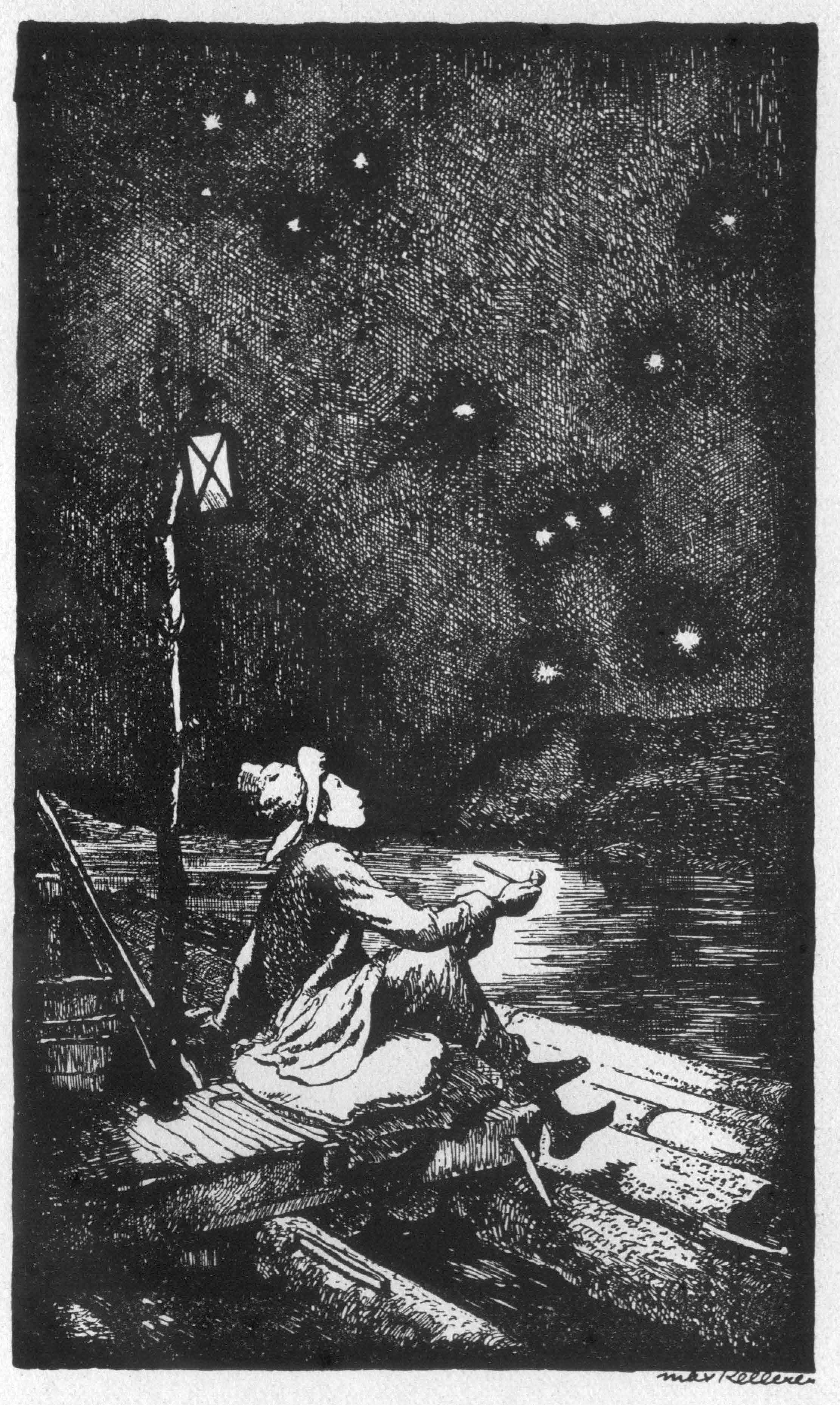 | Huck Finn's Fahrten und Abenteuer | 1944 | Bebié, Irma Anita | 16 | 9 | 1 | Here I is, Huck | -huck -jim -2p -boat -animal -drawing | hf_1944_beb_ch016_ill1 |