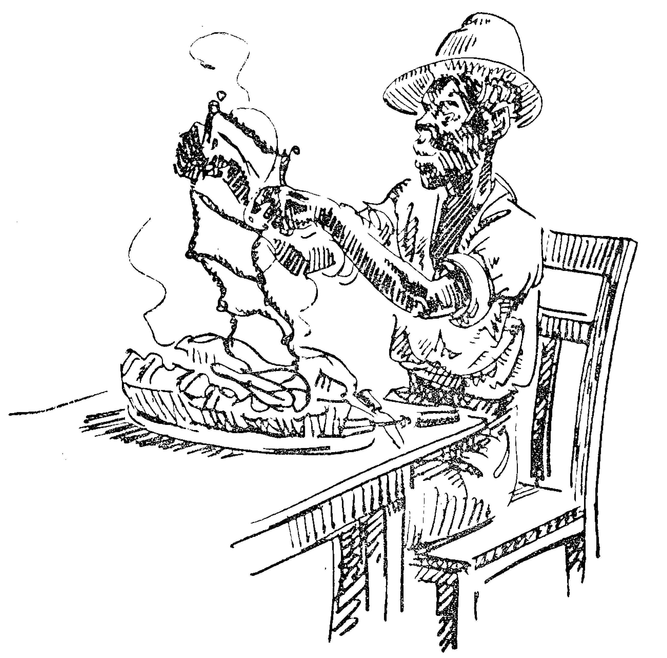 | Huck Finn's Fahrten und Abenteuer | 1944 | Bebié, Irma Anita | 19 | 11 | 2 | Dinner with Duke and King | -huck -jim -king -duke -4p+ -animal -drawing | hf_1944_beb_ch019_ill2 |
