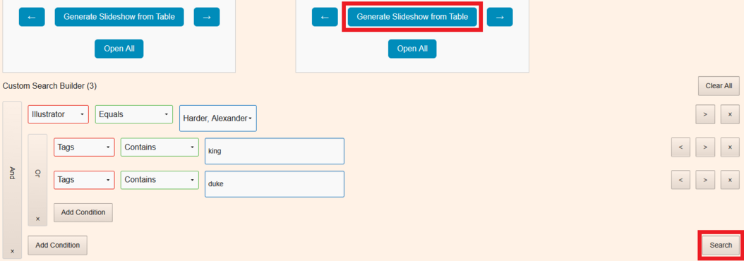 Filtering the catalog of the comparison tool works the same as filtering the sortable catalog. Instead of only generating a full-page gallery of the relevant illustrations, the comparison tool also allows users to create two separate slideshows using different sets of illustrations which can then be compared side by side. To showcase the comparison tool's functionality, the Custom Search Builder is used.
